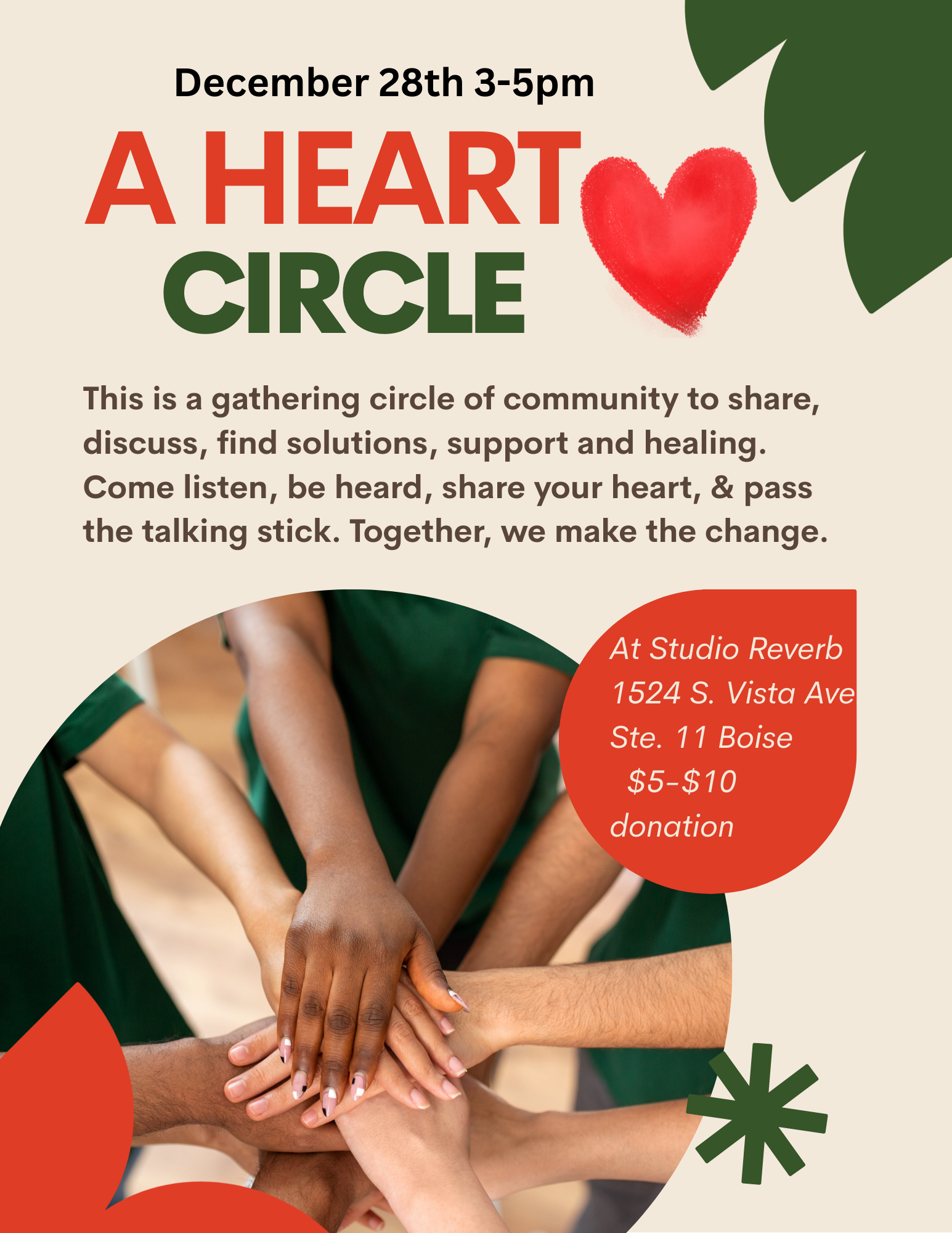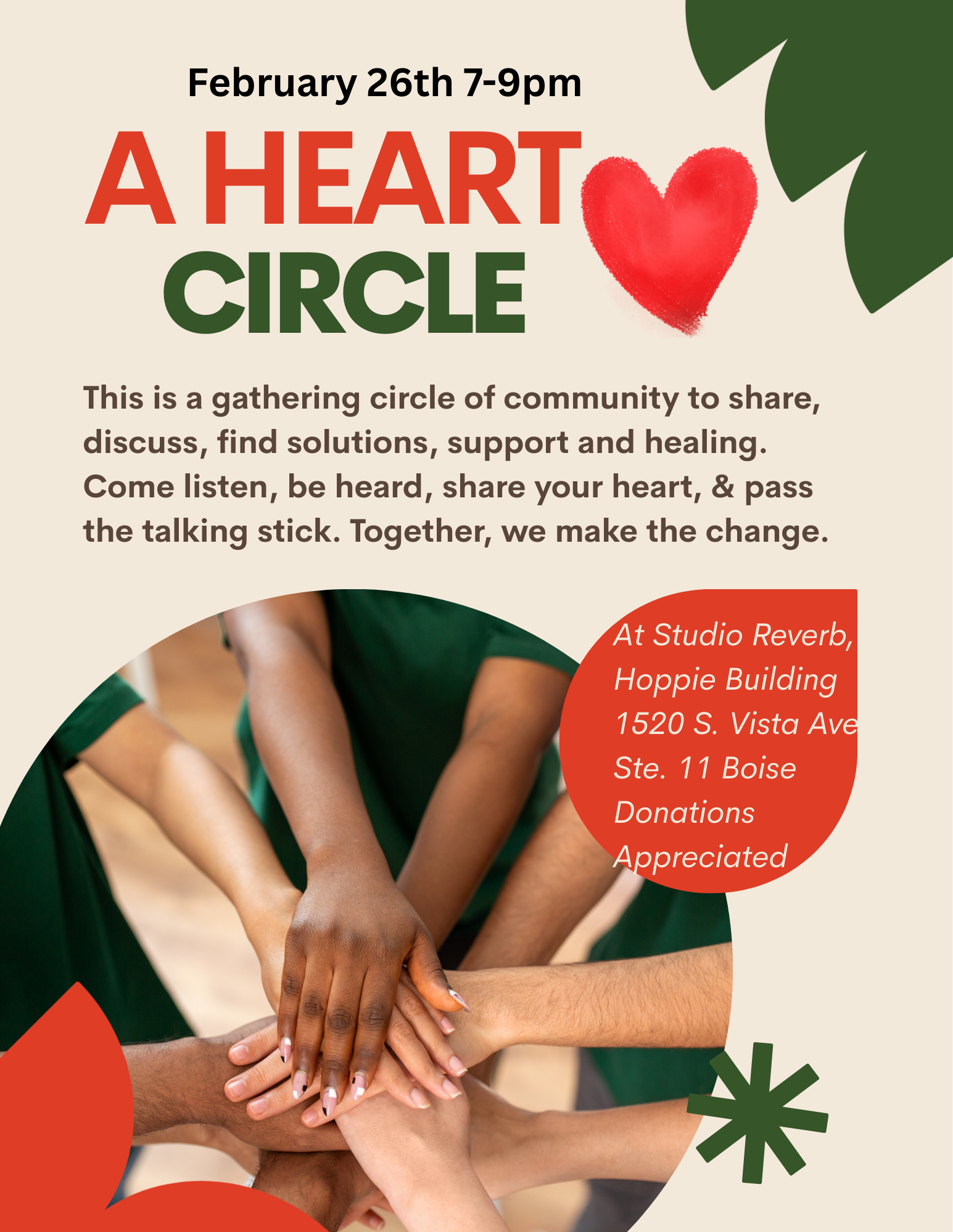 Come join a healing and discussion circle February 26th to share what's on our heart and minds, and hold space for others. Long ago we all sat in circles regularly and talked in council. We came up with solutions for the tribe, we heard stories, we laughed, celebrated and cried and were held by listening ears and a loving gaze.